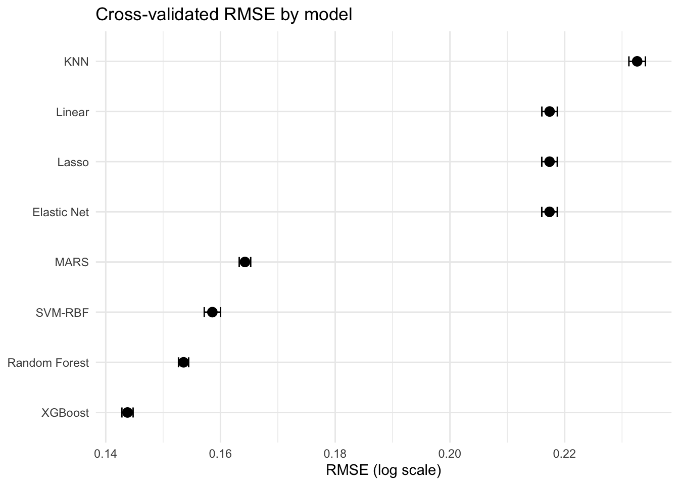 Eight model families were evaluated using 5-fold cross-validation with 3 repeats, stratified on log sale price. Each model was paired with the preprocessing recipe that produced its best performance. RMSE on the log scale is the primary comparison metric throughout.