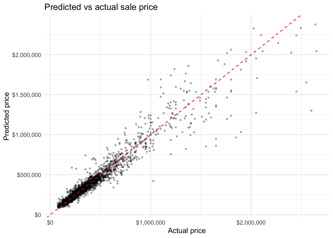 ggplot(test_preds, aes(x = sale_prc_actual, y = sale_prc_predicted)) +geom_point(alpha =0.3, size =0.8) +geom_abline(color ="red", linetype ="dashed") +scale_x_continuous(labels = scales::dollar_format()) +scale_y_continuous(labels = scales::dollar_format()) +labs(title ="Predicted vs actual sale price",x ="Actual price",y ="Predicted price" ) +theme_minimal()