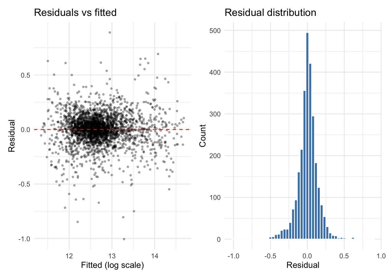 test_preds <- test_preds %>%mutate(residual = sale_prc_log - .pred)p1 <-ggplot(test_preds, aes(x = .pred, y = residual)) +geom_point(alpha =0.3, size =0.8) +geom_hline(yintercept =0, color ="red", linetype ="dashed") +labs(title ="Residuals vs fitted", x ="Fitted (log scale)", y ="Residual") +theme_minimal()p2 <-ggplot(test_preds, aes(x = residual)) +geom_histogram(bins =50, fill ="steelblue", color ="white") +labs(title ="Residual distribution", x ="Residual", y ="Count") +theme_minimal()p1 + p2