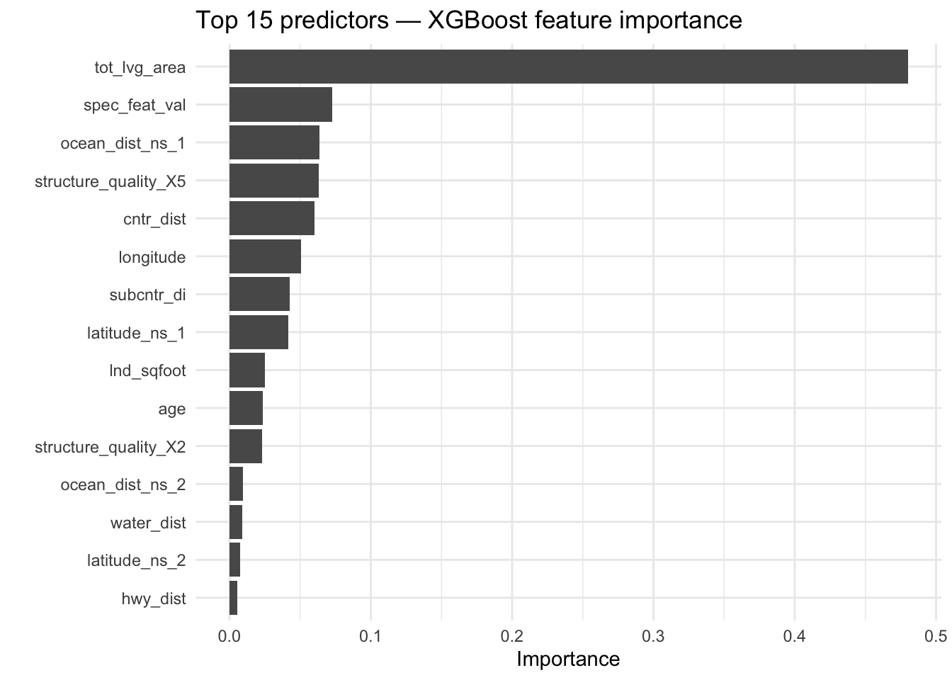 Ocean distance is the dominant predictor by a wide margin, consistent with Miami’s geography where waterfront proximity commands a significant price premium. Latitude and longitude rank highly, capturing neighborhood-level price variation that distance variables alone cannot fully explain. Structural quality and living area are the strongest property-level predictors, confirming that buyers weigh both location and physical characteristics heavily. Highway distance and property age contribute more modest but meaningful signal. The prominence of the EDA-engineered features, including the log-transformed highway distance and natural spline terms for latitude and ocean distance, in the top predictors validates the feature engineering approach taken in this project.